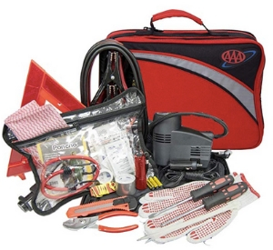 The road trip kit from AAA has booster cables, flashlight, air compressor, and a first aid kit.