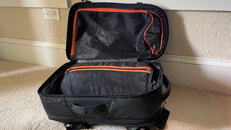 The Outwalk 1.0 is a carry-on sized backpack (45″H X 32″W X 19″D) and fits up to a 17″ laptop, although I wouldn’t recommend traveling with a 17” laptop if you can avoid it as they are heavy. It’s matte black on the outside, with orange highlights on the inside, and can also be carried on its side like a briefcase if you’d like to change things up. It feels very sturdy and appears to be well-constructed and water resistant, so it should stand up to years of travel adventures.