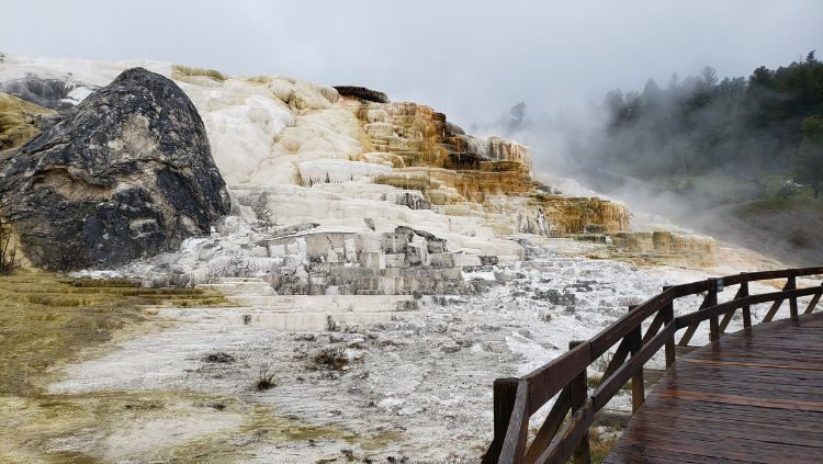 We stopped off to see Mammoth Hot Spring but didn't hike the area given that rain was pouring down. Instead, we headed south towards Fishing Bridge where we would spend the night.