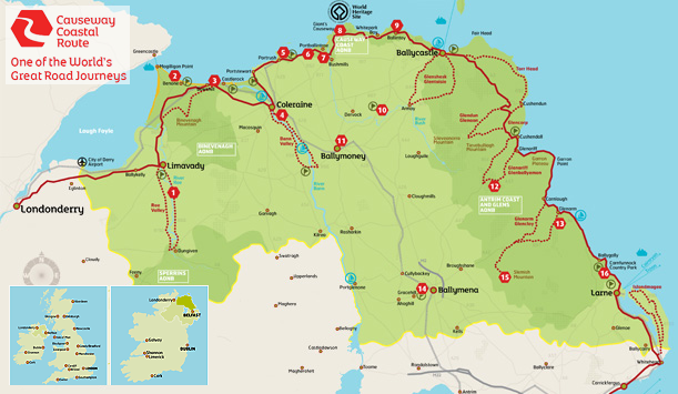 The Causeway Coastal Route showing the main route and its many tributaries.