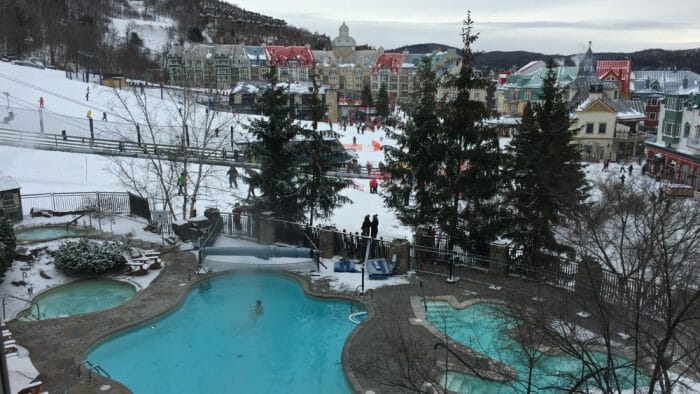 View of the spa at the Fairmont Hotel and base of Mont Tremblant from The Fairmont Axe bar.