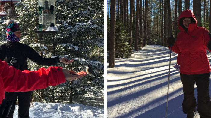 There are over 75 km of groomed, cross-country ski trails at Mont Tremblant. Of course, there are short loops as well as longer ones. On the right, I'm in the stunning Grand Allee on a gorgeous day with the sun streaming through the trees. On the left, a chickadee is eating out of my hand. Across from where the birds are is a covered refuge with benches around a wood-burning fireplace.