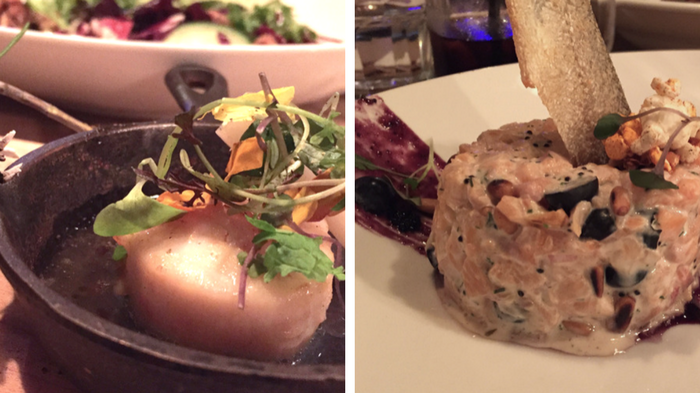 Scallops in a cedar reduction on the left and trout tartare on the right. A delicious meal at Le QG.