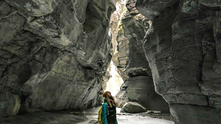Once in Jasper sign up for a guided Maligne Canyon tour. When I went, the guide entertained us with information and stories of the area’s history, wildlife, and geology. The Maligne translates to “evil” in French and it got the name from the water’s habit of appearing and disappearing. With crampons on our feet for grip on the ice, the guide led us right onto the frozen river and then up the canyon. We squeezed into an ice cave, walked behind a frozen waterfall, and watched ice climbers dance skyward.