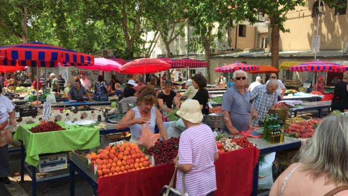 The Pazar food market is located right next to the east wall of the Diocletian Palace. It's open 7 am to 2 pm. There is also a clothing and housewares market near by that the locals shop at as well.
