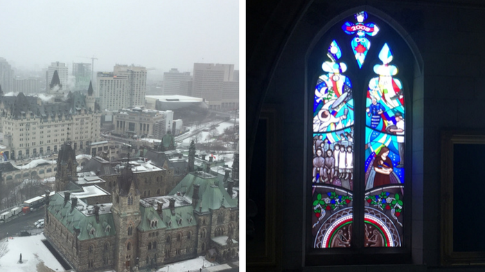 On the left is a view of downtown Ottawa from the Peace Tower of the Parliament Buildings on a snowy day. On the right is a new stained glass window.