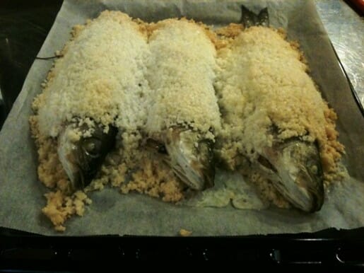 On the appointed evening, I found my way to Chef Parade in Prague 3, Zizkov. Over the next 3 or 4 hours, my 4 classmates and I chopped, stirred, sautéed, baked and simmered our way through a wide array of fish and seafood, under the guidance of Chef Ludek Munzar. We cooked things that I have always enjoyed eating, but have never attempted at home: whole fish baked in a salt crust, squid ink risotto, marinated octopus salad (beginning with a huge, slimy, whole octopus!) and an interesting version of bouillabaisse that involved straining out all of the expensive ingredients, and adding a generous amount of ouzo. Oh, yes.
