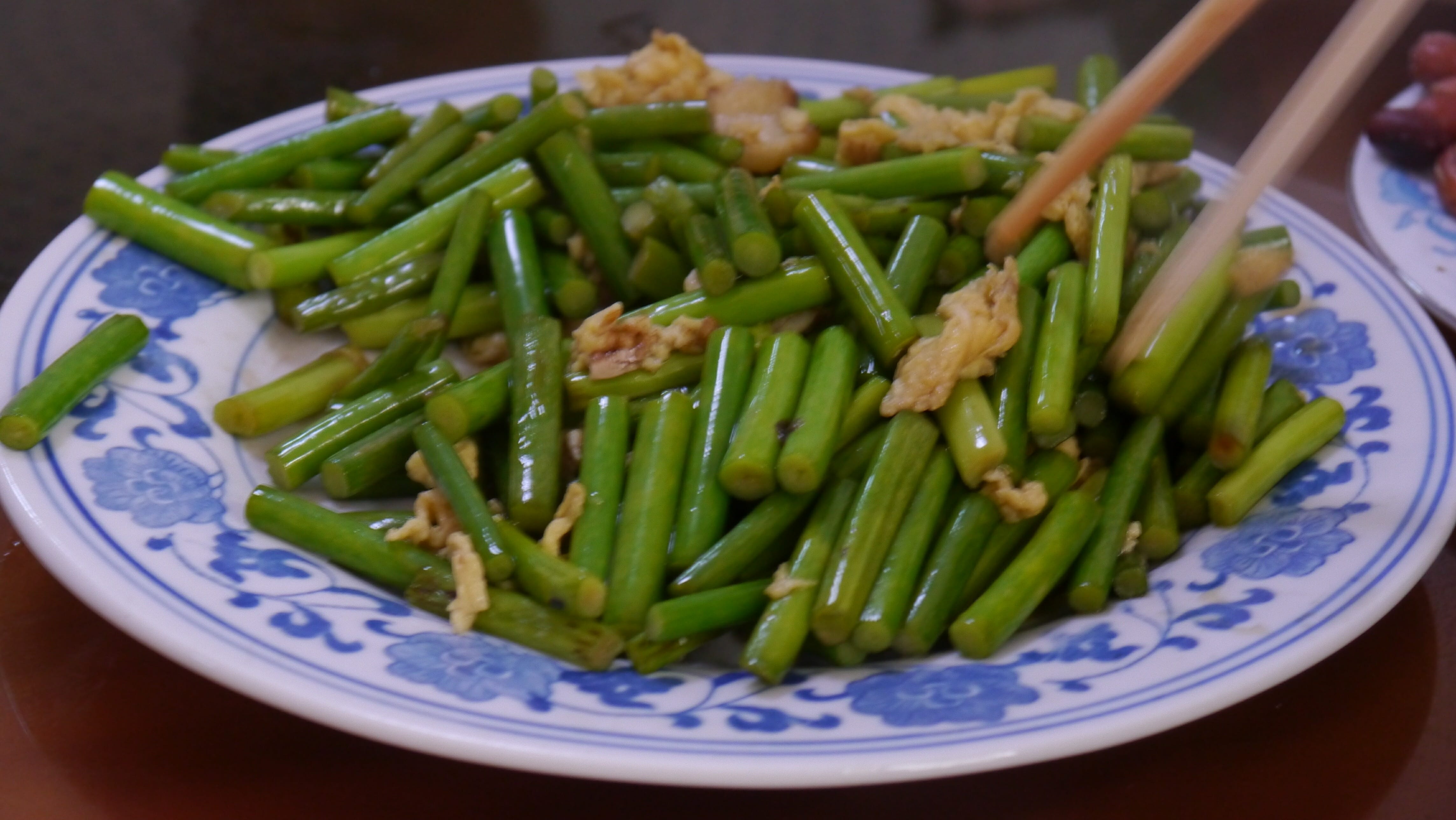 The food was wonderful. These are stir-fried garlic stems. Such a delicate, delicious garlic flavor.