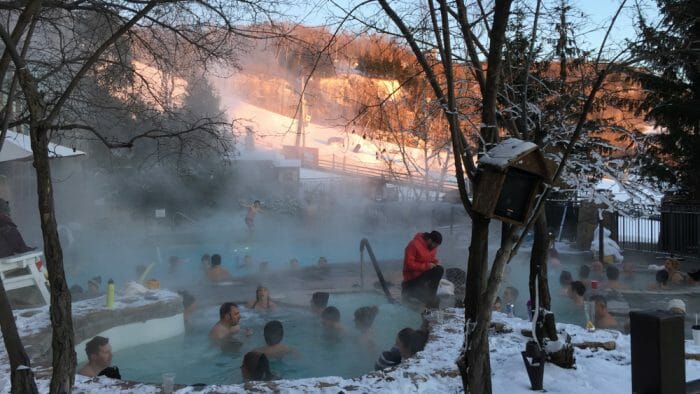 View of the spa at the Fairmont Hotel and base of Mont Tremblant from The Fairmont Axe bar.