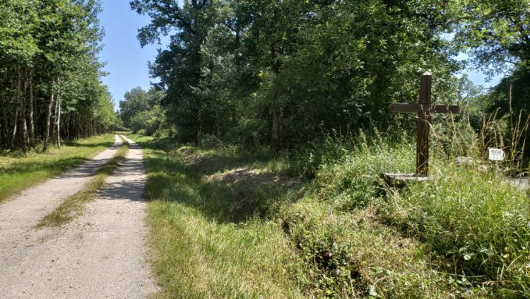 - Follow the road as it winds up past the church and under the concrete bridge to arrive at a junction. Continue following the road straight ahead for 200 m where you bear left onto a track keeping the cross on your right hand side.